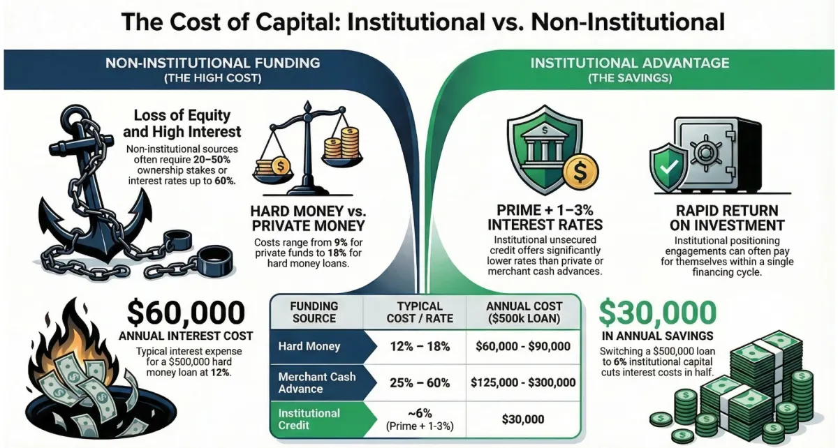 Institutional unsecured credit typically costs: Prime + 1–3% (6-8%)